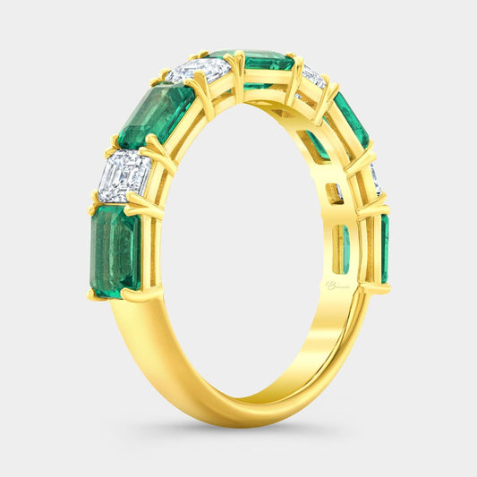 Natural Green Emerald and Asscher Cut Diamond Yellow Gold Band