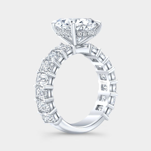 Cushion Diamond Hidden Halo East–West Emerald Cut Diamond Band Platinum Engagement Ring