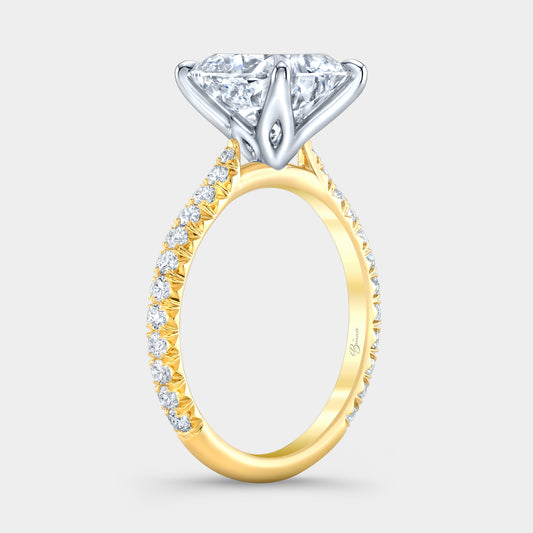 Cushion Diamond Tulip Tapered Cathedral French Pave Yellow Gold And Platinum Engagement Ring