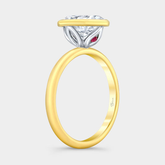 Oval Diamond Tulip Bezel Set With Peekaboo Ruby Accents Yellow Gold And Platinum Engagement Ring