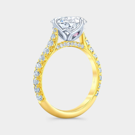 Oval Diamond Tapered Cathedral French Pave Hidden Halo Yellow Gold And Platinum Engagement Ring