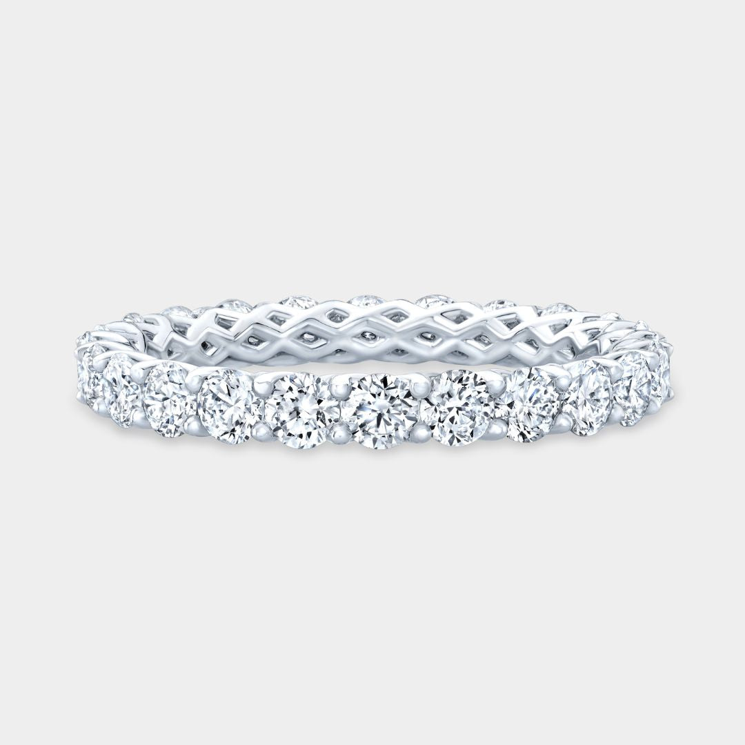 Delicate and timeless, this platinum eternity band showcases a graceful trellis design adorned with round cut diamonds totaling approximately 1.25 carats. The slender 2.40mm band offers an elegant sparkle, perfect for complementing any engagement ring or wearing alone as a symbol of everlasting love.