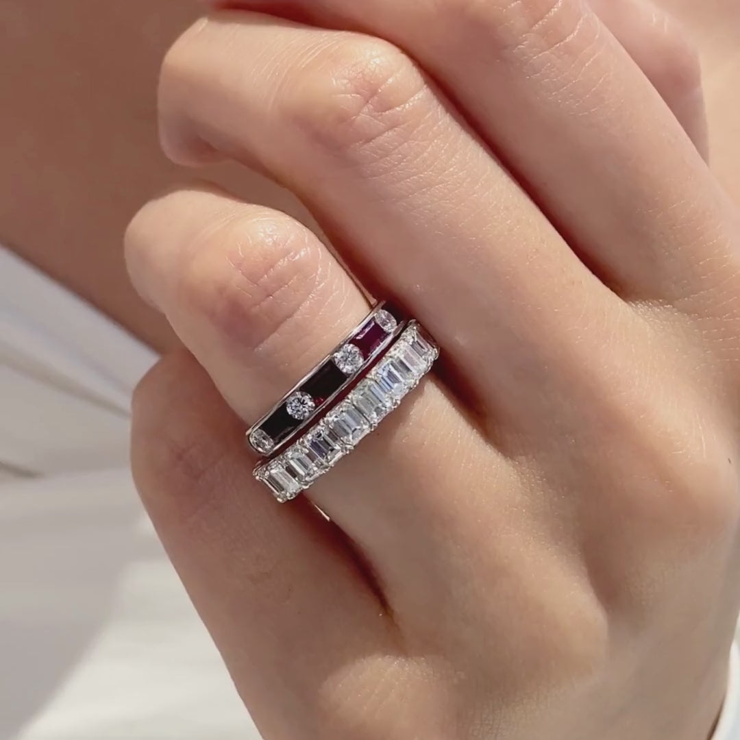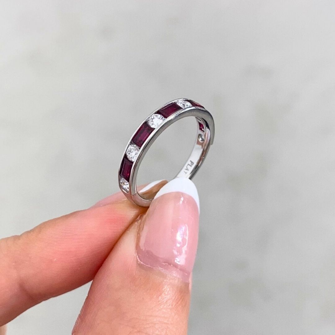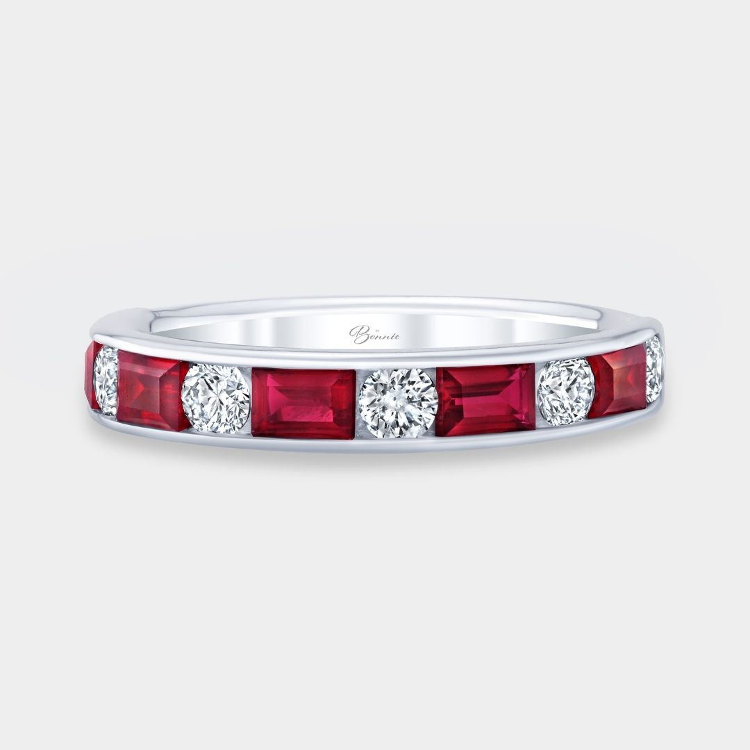 A vibrant mix of color and brilliance, this platinum wedding band features natural baguette-cut red rubies alternating with natural round colorless diamonds. Set in a sleek channel design, the stones create a striking rhythm of fiery red and radiant sparkle. The 1/2 way setting ensures comfort while showcasing ~1.20ct of fine gemstones, making it a timeless and elegant piece.