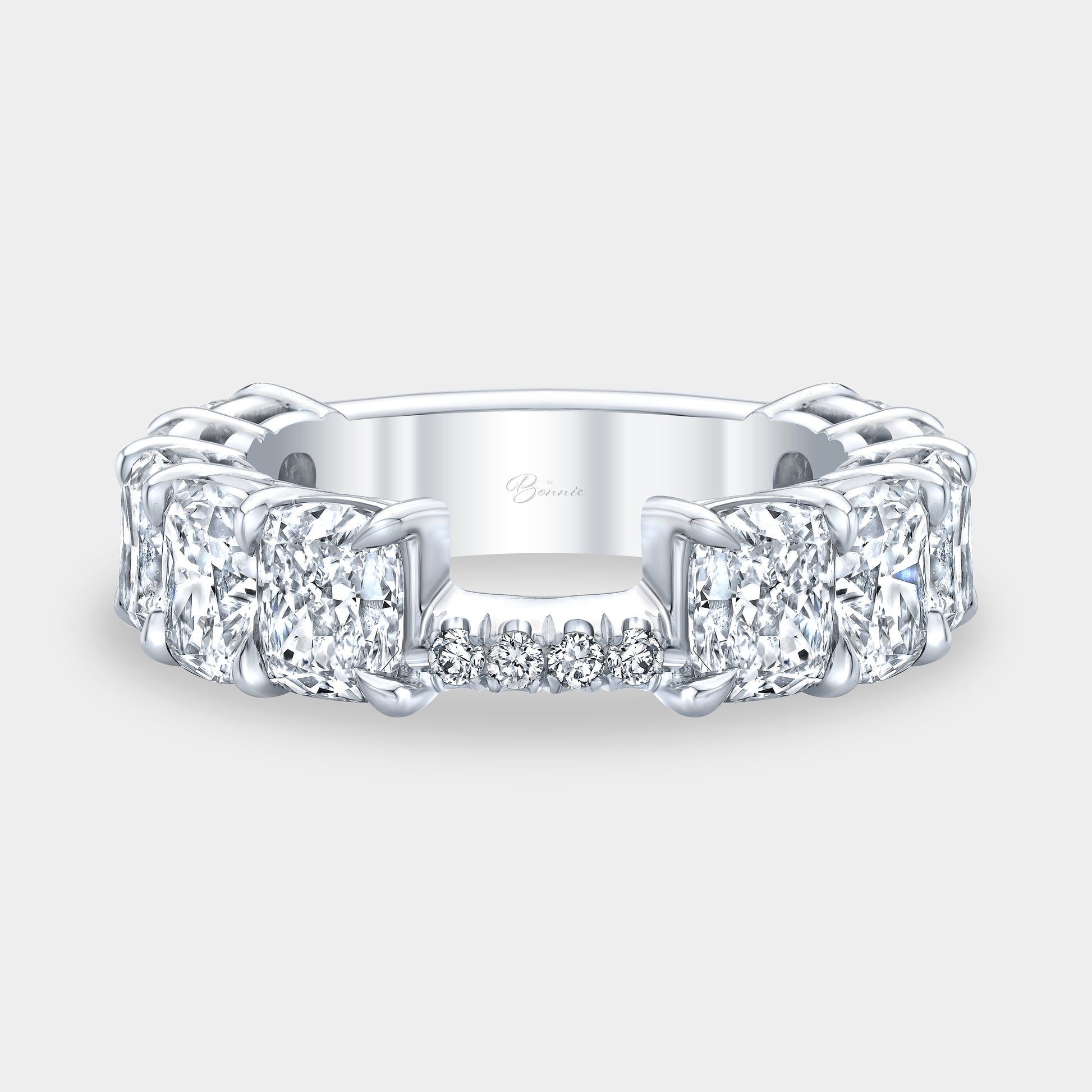 We designed this engagement ring and wedding band to sit perfectly flush together (wedding band has a contour). The center showcases a breathtaking 10 carat emerald cut diamond in platinum, set low with a hidden halo for that soft, seamless sparkle. Slightly elongated cushion cut accents frame the emerald silhouette, adding just the right amount of contrast.