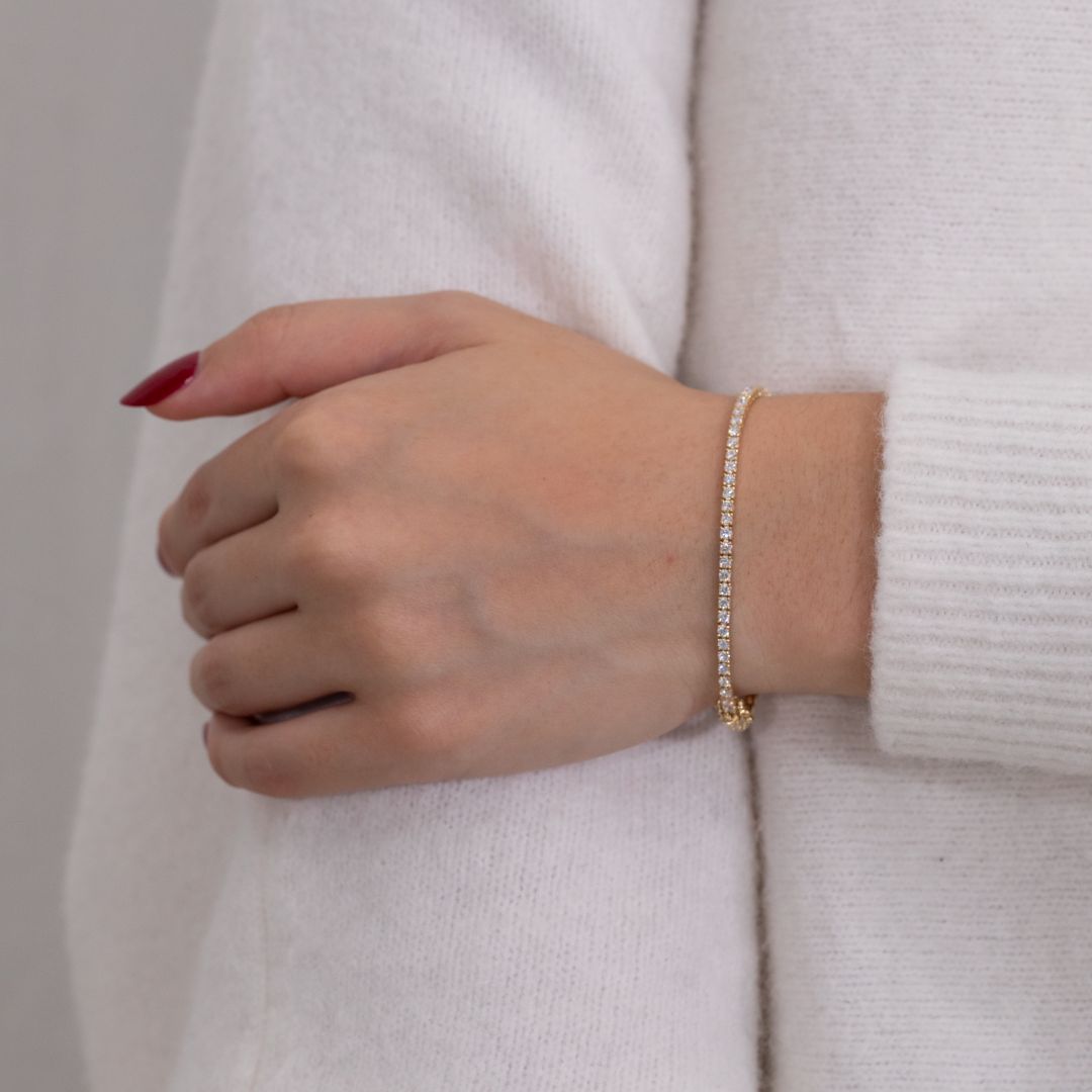 Delicate brilliance designed for refined elegance. This classic 2.25ct lab grown round diamond tennis bracelet features a continuous line of perfectly matched diamonds set along a 2.00mm 14k yellow gold band, creating a subtle yet radiant sparkle. Measuring 6.25 inches, it is ideal for smaller wrist sizes, offering a timeless design that can be worn alone or layered with other pieces for versatile style.