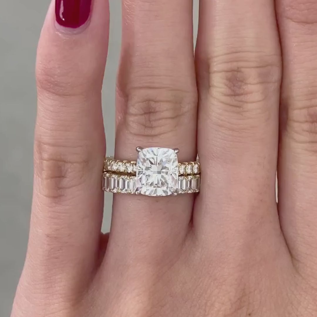 Romantic and refined, this engagement ring highlights a 2.42ct lab grown cushion cut diamond certified by GCAL, with G color and VS1 clarity. The two-tone design in 14k yellow gold and platinum features a tulip basket that gracefully elevates the diamond. A 2.40mm French pavé band set with sparkling round brilliant diamonds adds brilliance and charm, making this ring an exquisite symbol of love.
