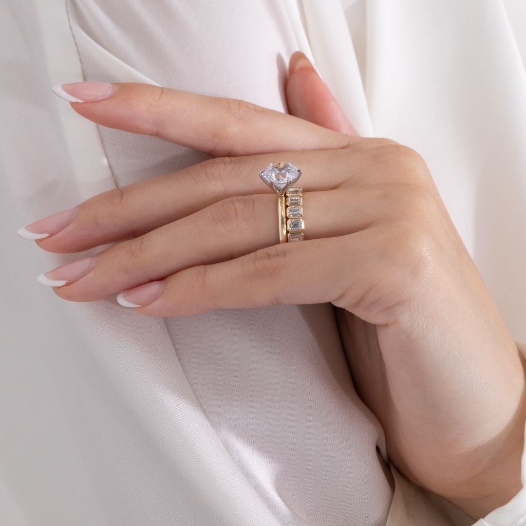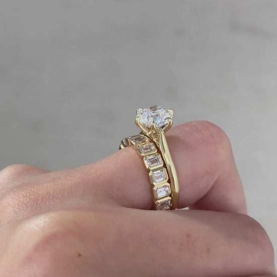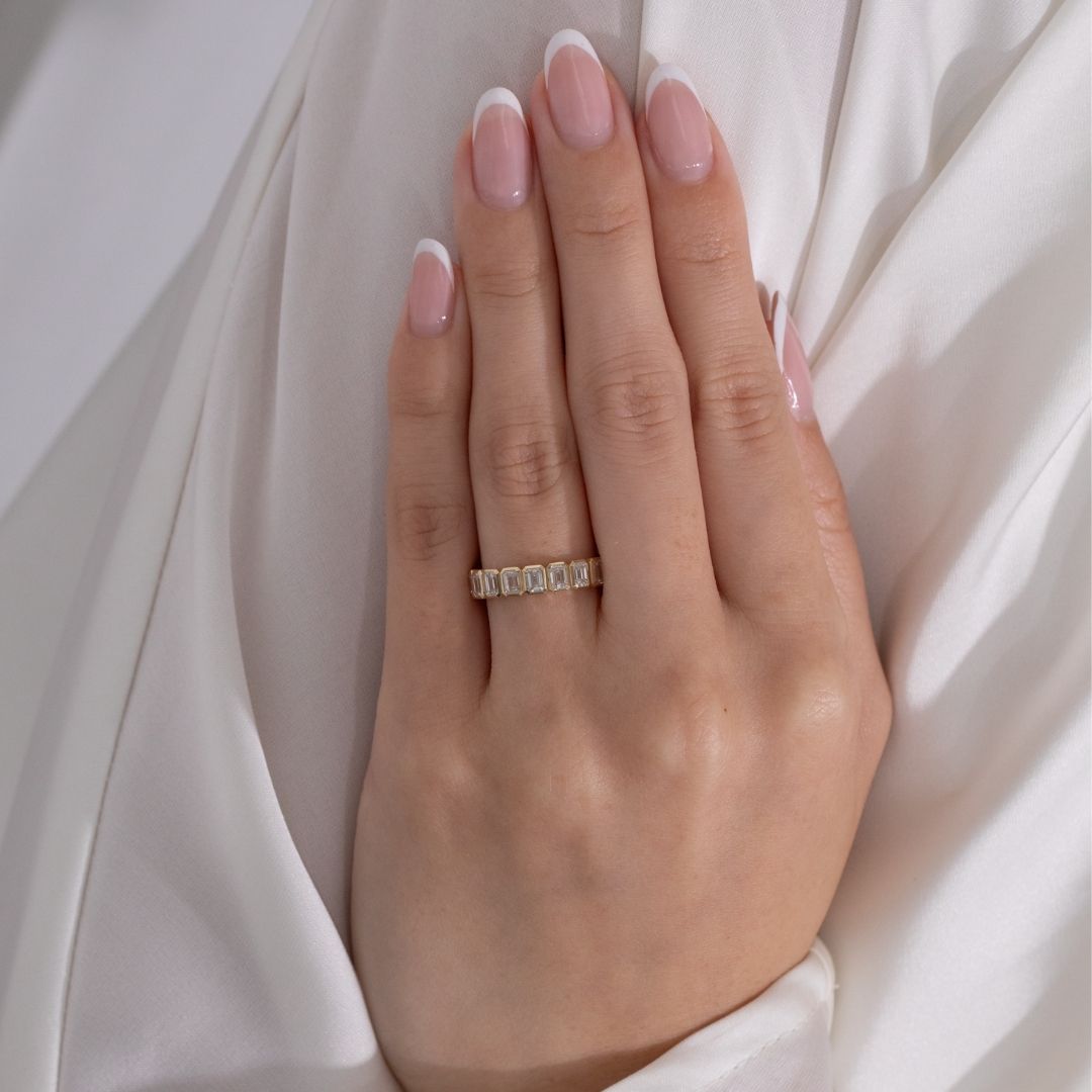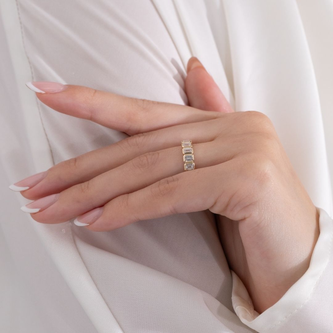 Crafted in 14k yellow gold, the warm metal beautifully complements the elongated facets of the emerald cut diamonds, enhancing their clarity and refined sparkle. With a 4.20mm profile, this band offers the perfect balance of presence and everyday comfort, ideal as a wedding band, anniversary ring, or striking stackable piece.