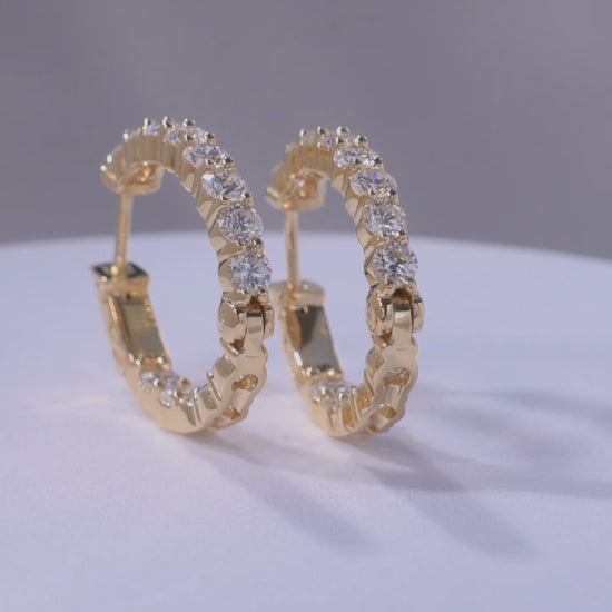 Elegant and eye-catching, these Round Shaped Inside Out Hoop Earrings sparkle with every movement. Set in warm 14k yellow gold, the design features lab grown round diamonds meticulously arranged in a shared prong setting, both inside and out, for continuous brilliance. Their 1-inch size offers the perfect balance of everyday wear and statement glamour, making them a timeless addition to any collection.