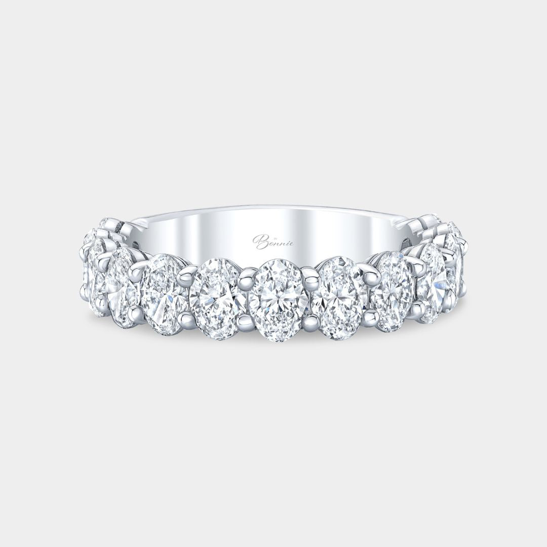 Celebrate timeless elegance with this anniversary band featuring approximately 3.50 carats of oval cut diamonds. Each stone is expertly set in platinum, allowing its elongated facets to reflect light from every angle. The double gallery design enhances the profile with intricate detail, while the 5.00mm width offers a perfect balance of presence and sophistication. Ideal for marking life’s milestones or adding brilliance to any stack.