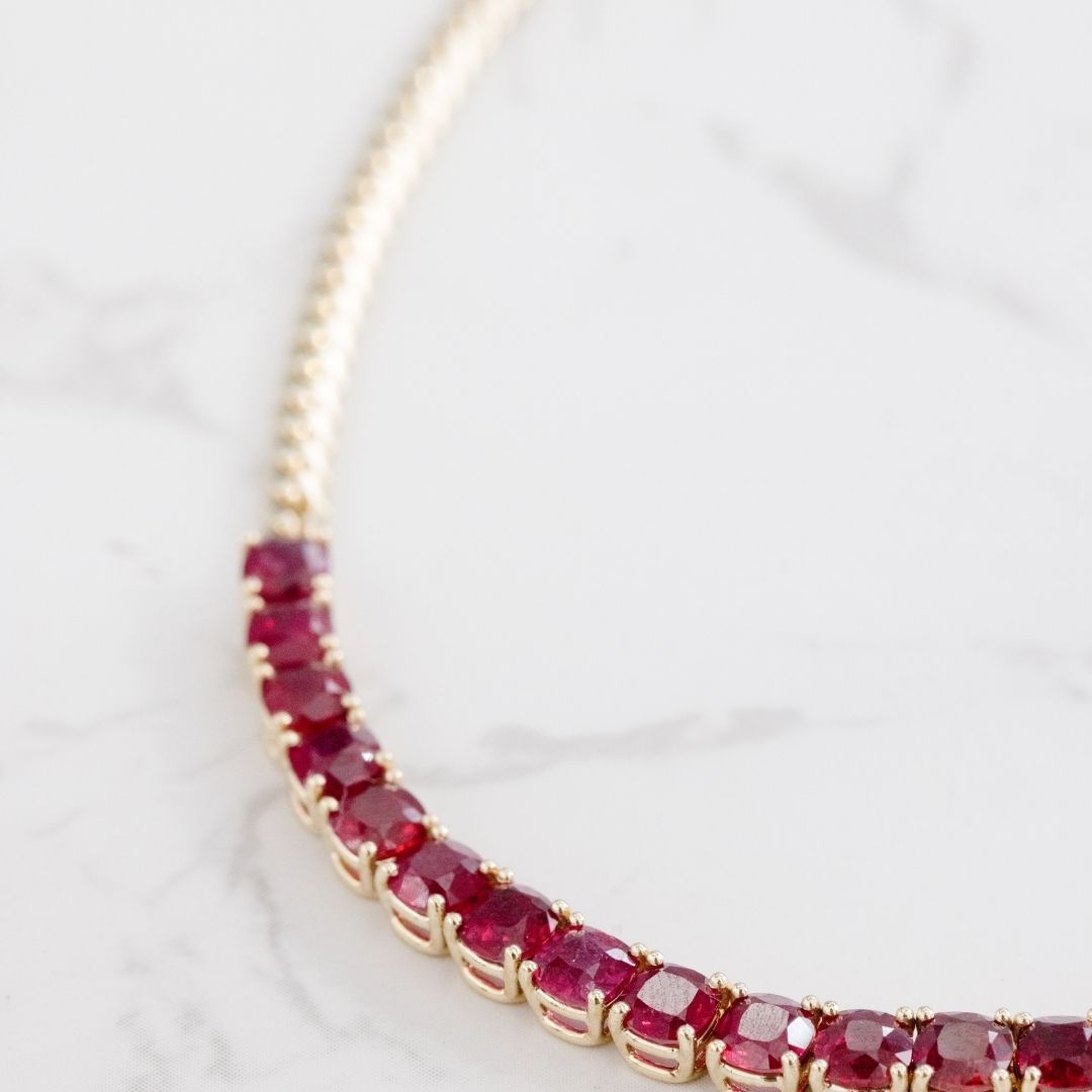 Bold, luxurious, and unmistakably striking, this Natural Cushion Cut Ruby Cuban Tennis Necklace is a true statement of passion and elegance. Featuring vivid red rubies set in rich 14k yellow gold, the Cuban-inspired design offers a modern edge while maintaining timeless sophistication. Each cushion-cut ruby radiates depth and intensity, creating a powerful contrast against the warm gold tones. Crafted to order, this necklace is as unique as the story it represents.