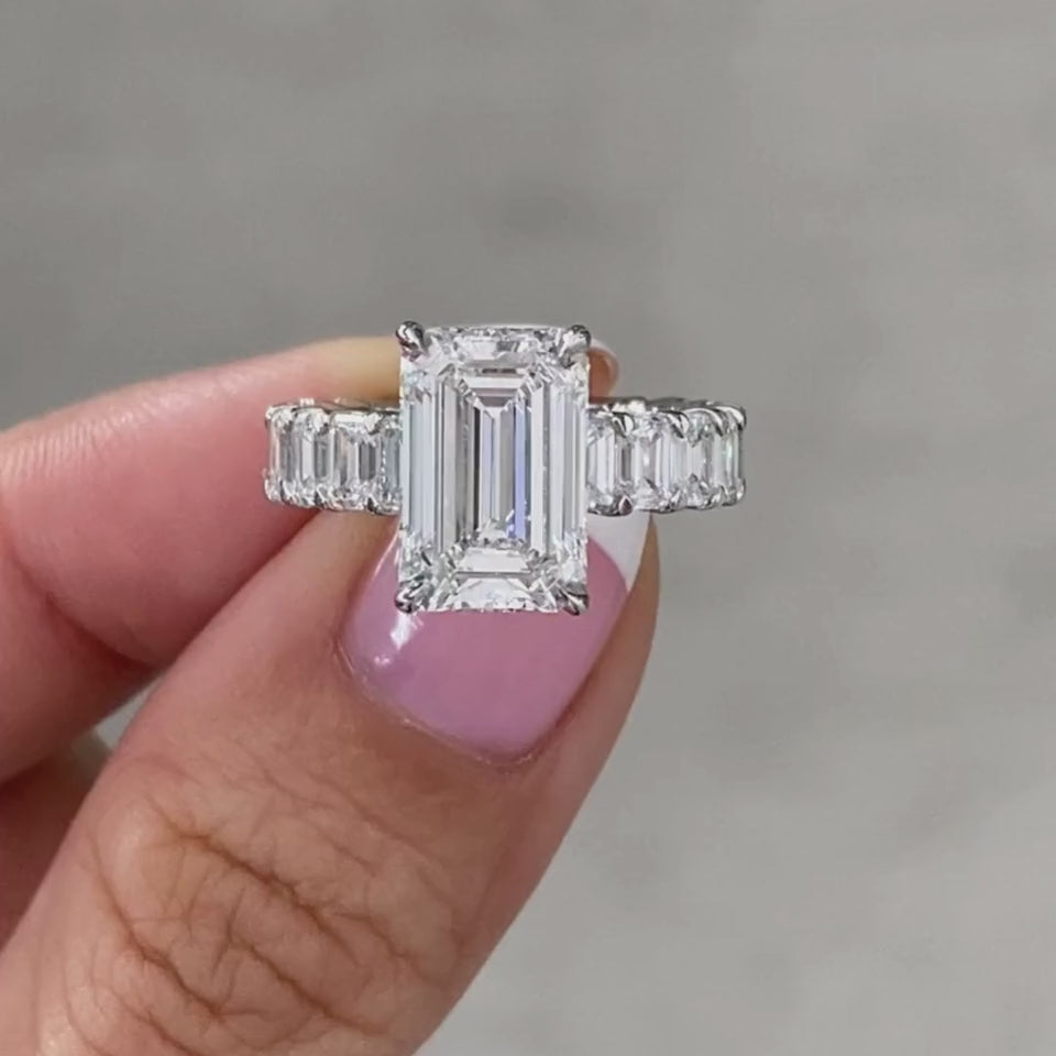 An extraordinary symbol of refinement and radiance. This 4ct emerald cut diamond takes center stage in a platinum setting that exudes quiet luxury. A hidden halo adds a secret shimmer beneath the stone, while the signature Chloe band—set with emerald cut diamonds three-quarters of the way around—delivers a bold and sculptural elegance. With 4.30mm of polished platinum and ~3.50ct of side stones, this piece is the perfect harmony of strength and sophistication.