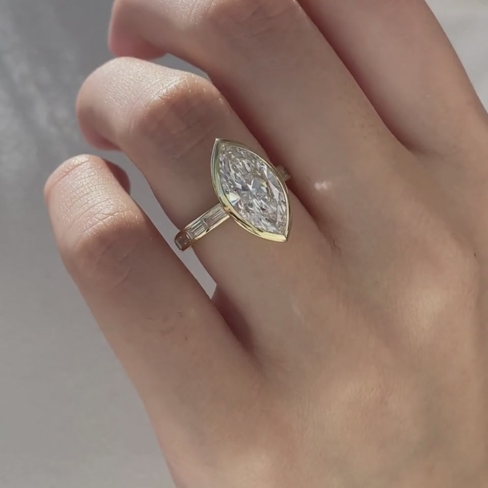 A fusion of sleek geometry and timeless elegance. This 14k yellow gold engagement ring features a 3ct marquise cut diamond in a bold bezel setting, offering clean lines and modern sophistication. Flanked by ~0.50ct of east-west channel set baguette diamonds, this design delivers an understated sparkle with a refined, architectural allure.