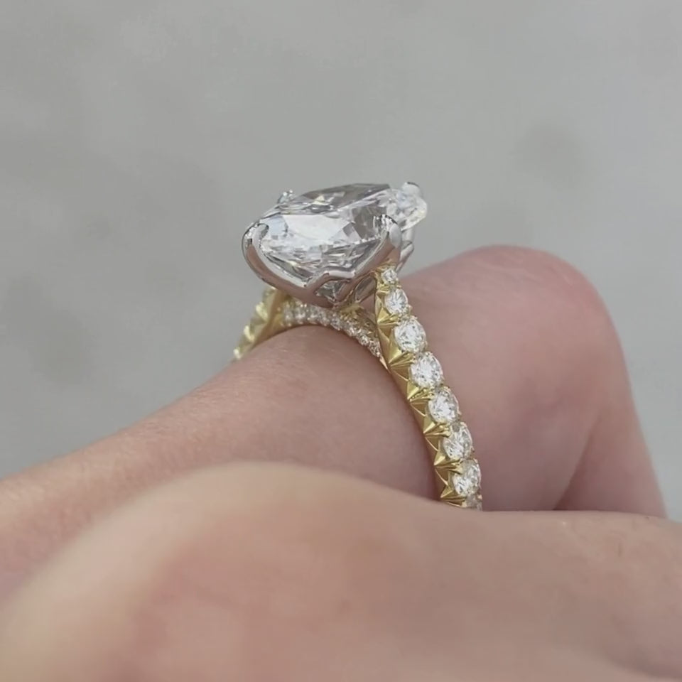3ct Oval Cut Diamond, Two Tone - 14k Yellow Gold & Platinum, Tulip Basket, North South Prong, with Peekaboo Purple Sapphires & Diamond Bridge, Tapered Cathedral, 2.60mm French Pave, ~0.80ct Engagement Ring