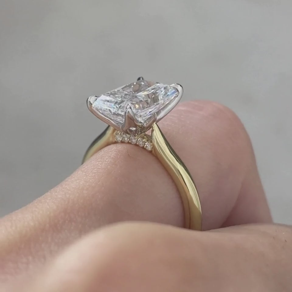 A radiant masterpiece designed to steal every glance. This breathtaking 3ct radiant cut diamond is gracefully nestled in a tulip basket, elevated by a refined tapered cathedral setting. The true surprise lies beneath—a pavé diamond bridge that adds a hidden sparkle with every movement. Crafted in luxurious two-tone 14K yellow gold and platinum, this 2.30mm solitaire ring blends classic beauty with a touch of modern intrigue.