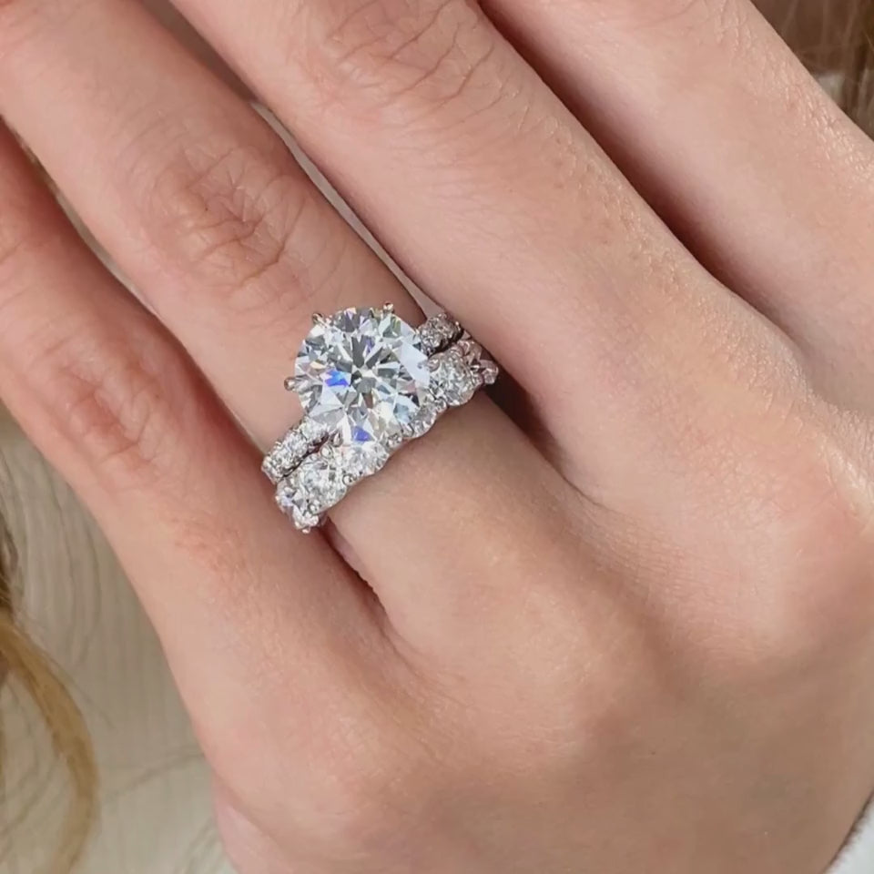 A striking blend of height and brilliance, this engagement ring showcases a 3.5ct round cut diamond in a 6-prong high-set design. A hidden halo adds subtle shimmer beneath the center stone, while the 2.50mm platinum band sparkles with 3/4 way French pave diamonds totaling ~0.65ct. A modern classic with elevated elegance.