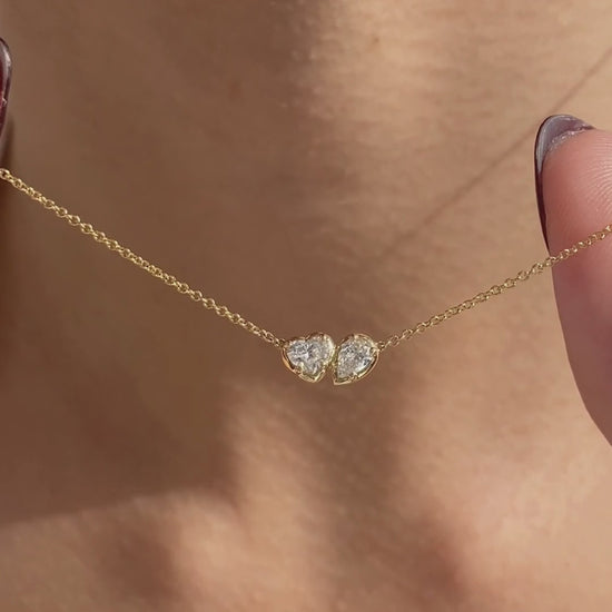 Toi Et Moi Heart & Pear Shape Diamond Bezel Pendant Yellow Gold Necklace